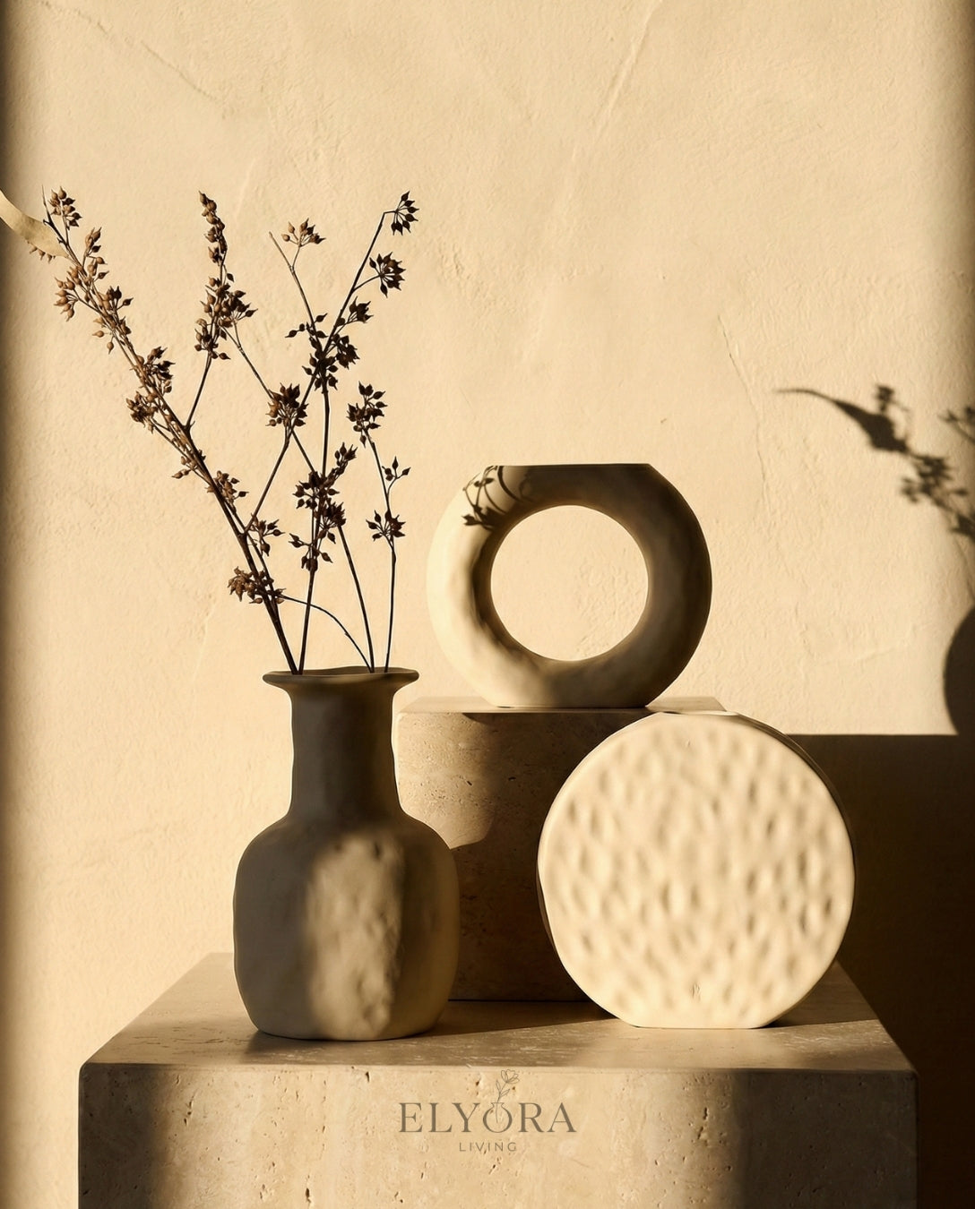 The Halo Trio brings together three sculptural silhouettes defined by intentional negative space and a handcrafted feel. The central "halo" form interacts with light, while the hammered texture invites touch, creating a grounded, artisanal presence.