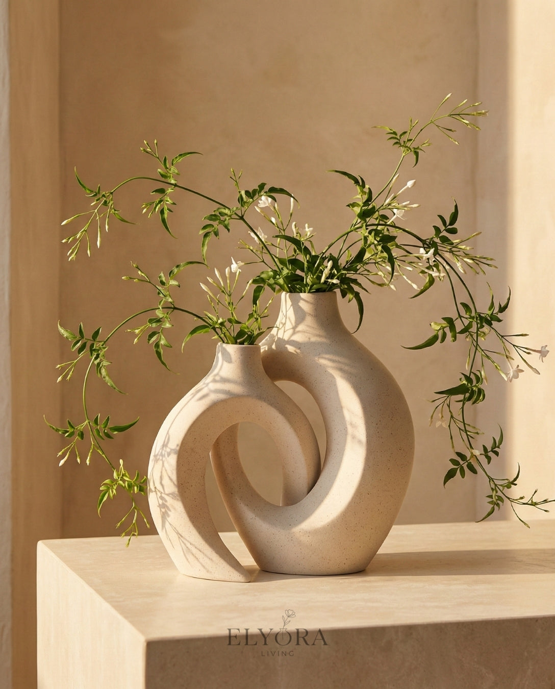 The Unity Pair explores the beauty of connection through two interlocking silhouettes. With their organic curves and shared negative space, these vessels seem to move around each other in a perpetual dance. The speckled stone texture adds a tactile, earthly warmth to their fluid shape.