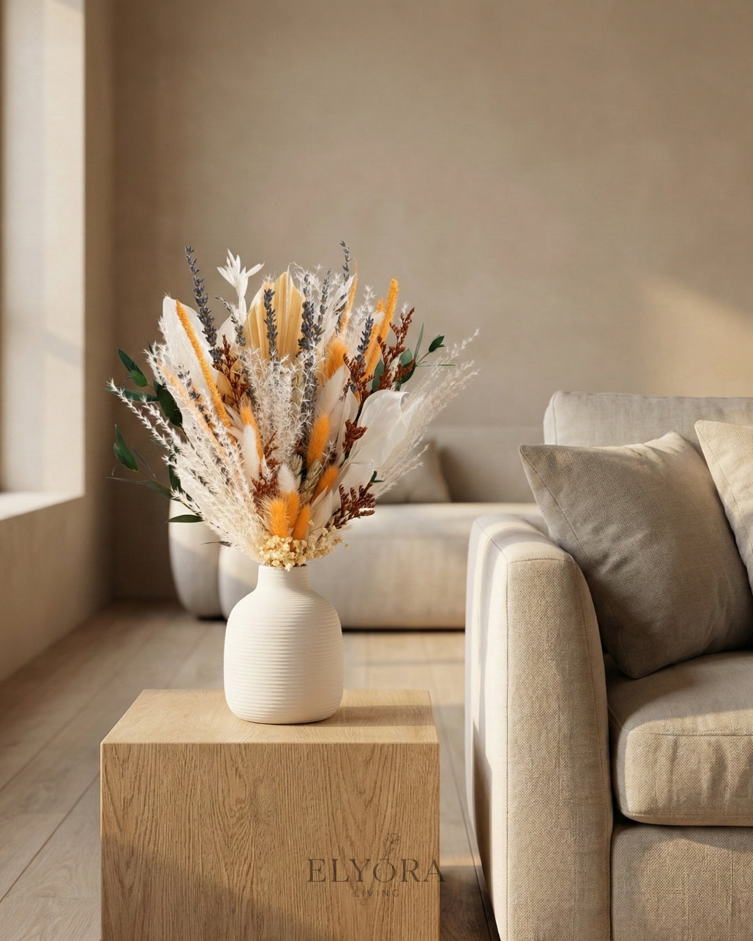 This artificial botanical bouquet brings together diverse plant forms in a vertically balanced arrangement. Layered textures and varying heights create depth and movement, resulting in a composed yet expressive presence for modern interiors.
